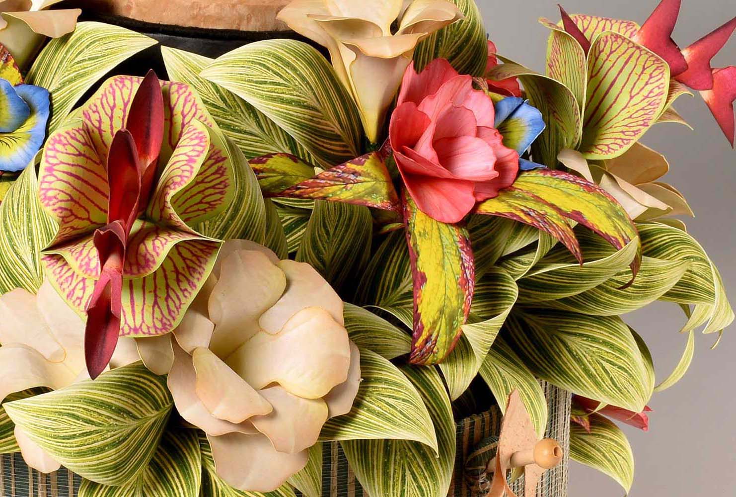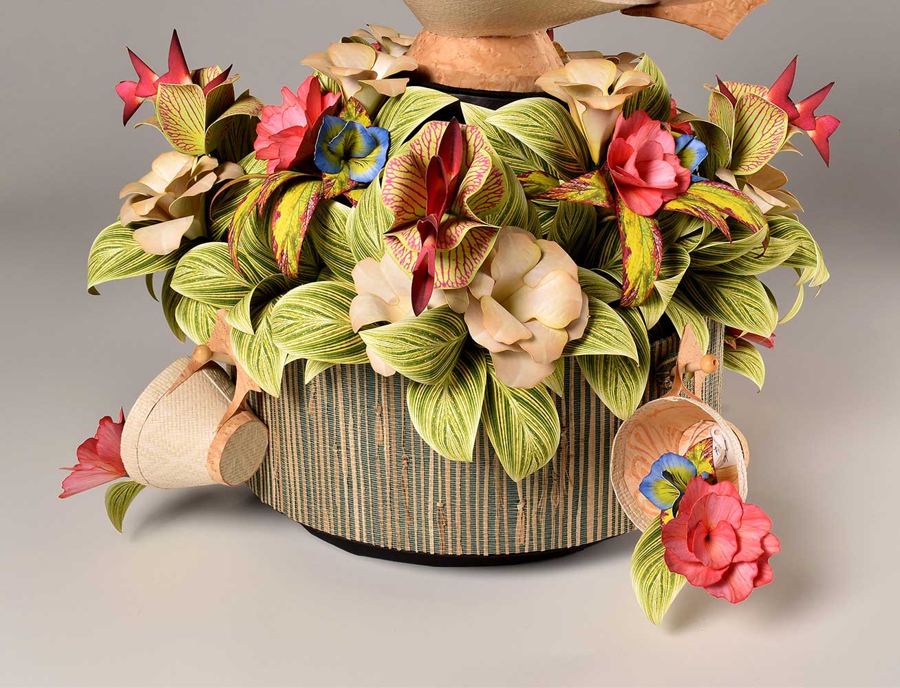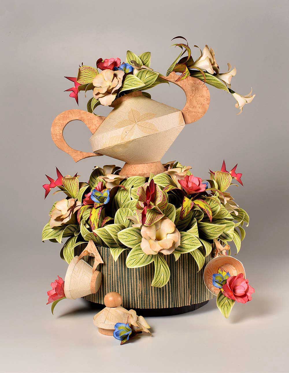 Jerolyn Crute Sackman used a variety of papers to construct this sculpture. She made the flowers and leaves from acid-free 60lb polar matte paper and Epson archival inks. The teapot, lid and cups are made of Japanese wallpaper and maple wood veneer. The base is made of Chinese handmade paper, Wyndstone sea black paper, and black handmade paper.